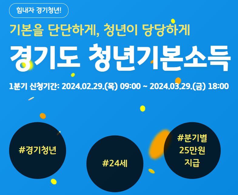 경기도 청년기본소득 지원은 경기도에 거주하는 24세 청년을 대상으로 분기별로 25만 원(년 100만 원)씩 지원하며 1분기 신청기간은 3월 29일(금) 오후 6시까지입니다.