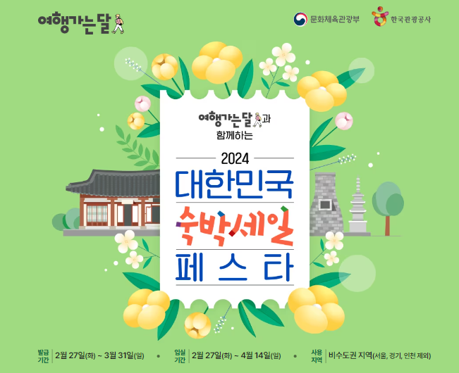 대한민국 숙박세일페스타는 서울, 경기, 인천을 제외한 전국 구석구석을 여행할 수 있는 숙박할인권의 발급기간은 3월 31일까지이며 입실기간은 4월 14일(일)까지로 넉넉하지만 각 여행사 별 숙박할인권이 소진되면 할인을 받을 수 없으니 봄꽃여행을 계획하고 계시다면 서두르시는 게 좋습니다.