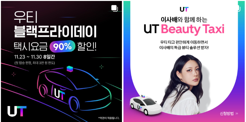 11월 23일(목)부터 11월 30일(목)까지 8일간 첫 탑승 한정, 최대 3만원 한도의 우티 블랙프라이데이 택시요금 90% 할인 이벤트와 이사배의 특급 부티 솔루션을 받을 수 있는 이벤트를 진행중에 있으니 우티 인스타그램에서 확인하시고 이용해 보시기 바랍니다.