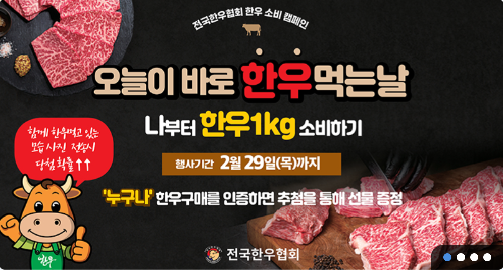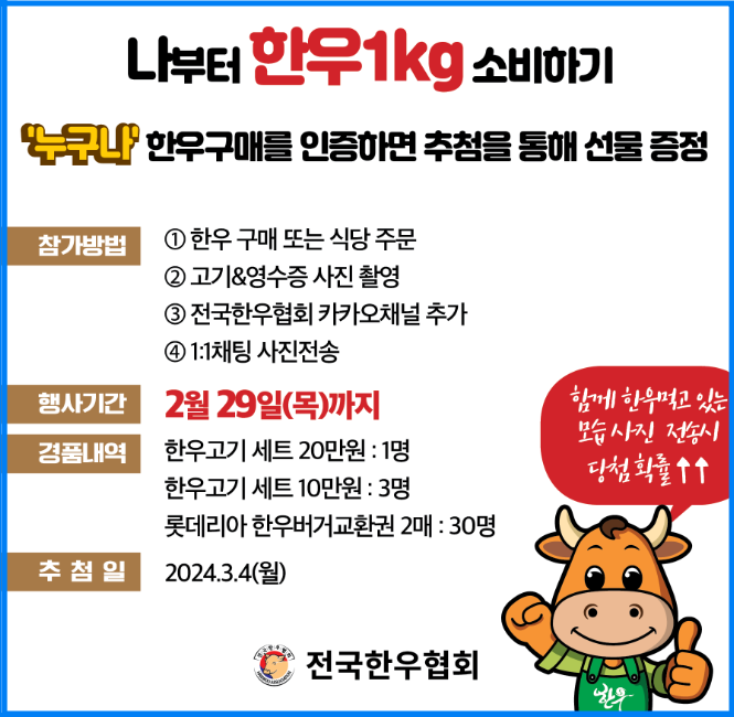 전국한우협회는 24년 설 명절을 맞이하여 한우이벤트를 2월 29일까지 진행하며 참가방법은 한우 구매사진 또는 식당 주문 영수증 사진을 촬영하여 전국한우협회 카카오채널을 추가 후 사진을 전송하시면 됩니다.